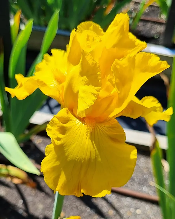Quasar’ (Bernard Hamner, R. 1986). Seedling# 82-5. TB, 35-36″ (89-91 cm), Midseason bloom. Ruffled chinese yellow; yellow orange beard. Catalyst’ X ‘Well Endowed’. Hamner’s Iris 1986. Honorable Mention 1988.