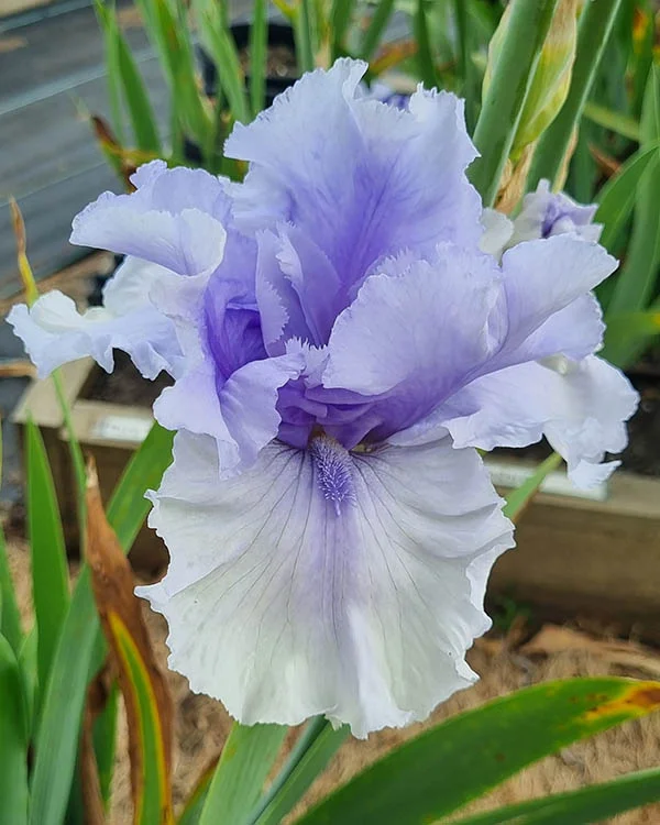 ”Queen Of Elegance’ (Barry Blyth, R. 1997). Seedling# C124-A. TB, 40″ (102 cm), Early midseason bloom. Standards pale silvery blue, deeper midrib flush; falls paler silver blue, deeper blended line below beard; beards silvery blue, tipped white; slight fragrance. Seedling# A77-4, ‘All Silent’ sibling X ‘Maybe An Angel’. Tempo Two 1997/98.