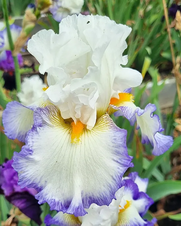 ‘Revision’ (Keith Keppel, R 2010) Seedling 04-93B. TB, 39″ (99 cm), Early to late bloom. Standards white; style arms white, pale blue lip; falls white, solid 3/8″ columbine blue (M&P 42-GH-10) band; beards bright golden yellow (darker than 9-L-6). ‘Brilliant Idea’ sibling Keppel seedling 2011. Prize winner of Moscow International TB Iris Competition 2009 (third place). Honorable Mention 2013, Award of Merit 2015