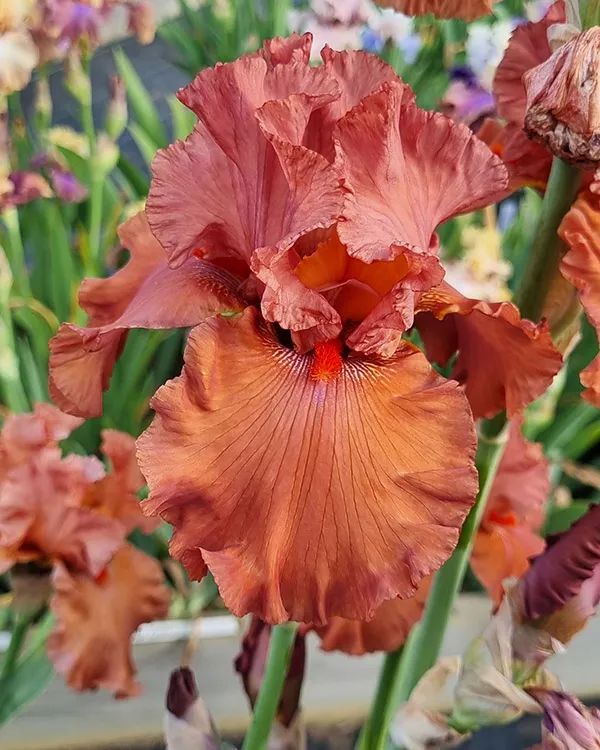 ‘Rusty Taylor’ (Graeme Grosvenor, R. 2009). Seedling# E69-08-1. TB, 37″ (94 cm), Early midseason bloom. Standards and falls orange tan; beards burnt orange-red; slight fragrance’ ‘Wearing Rubies’ X ‘Rustle of Spring’. Australian Dykes Medal 2016.