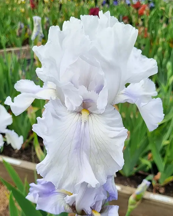 ‘Sajakeda’ (Graeme Grosvenor, R. 2005). Seedling# A136-3. TB, 36″ (91 cm), Early bloom. Standards white; falls white to palest blue, blue flush; beards orange yellow tipped white; sweet fragrance. ‘Second Option’ X ‘Reap The Rewards’. Rainbow Ridge 2005/06.