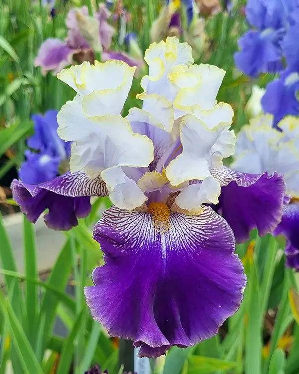 ‘Slovak Prince’ (Anton Mego, R. 2002). Seedling# AM-93/0038. TB, height 33″ (85 cm), Midseason bloom. Standards white shaded orchid lavender, slight blue veining, 1/8″ gold rim; style arms silver lavender veined blue, gold edge; falls dark velvety blue purple, slightly lighter rim, white area around gold beard with purple veining changing to brown; ruffled; slight sweet fragrance. ‘Edith Wolford’ X ‘Queen In Calico’. Aitken 2003. Honorable Mention 2005; Award of Merit 2007; Wister Medal 2009.