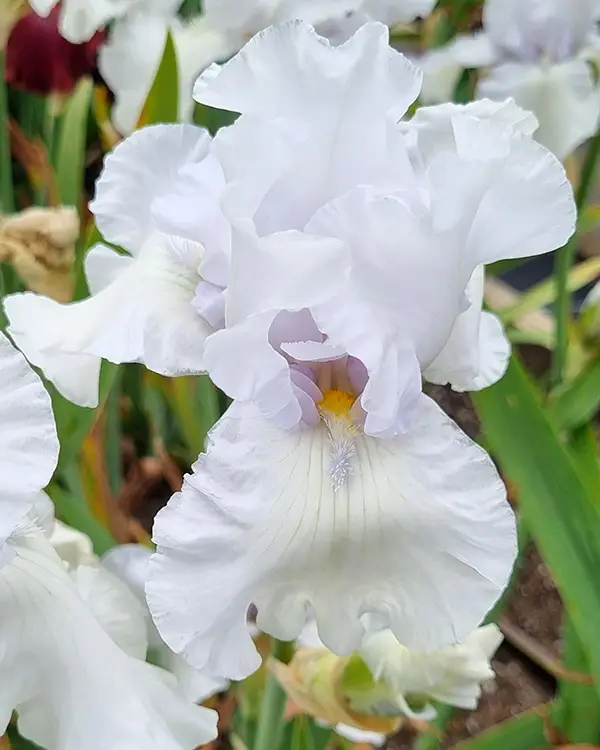 ‘Snow Blanket’ (Richard Ernst, R. 1991). Seedling# F123-4. TB, 38″ (97 cm). Early midseason bloom. Heavily ruffled white, pale lavender infusion at lower midrib of standards; beards tangerine, tipped yellow white; slight sweet fragrance. ‘Afternoon Delight’ X ‘Edna’s Wish’. Cooley 1991.
