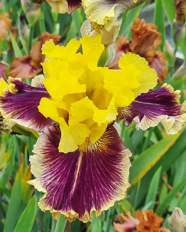 ‘Treasure Trader’ (Barry Blyth, R. 2008). Seedling# O304-1. TB, 37″ (94 cm). Very, Very early bloom. Standards lemon yellow; falls blended deep burgundy-rose deepening to burgundy-black at hafts and lightening toward edge to lemon buff rim; beards bright mustard yellow. Seedling# L304-1, ‘Platinum Class’ sibling, X seedling# M33-1: (‘Wearing Rubies’ x ‘Decadence’). Tempo Two 2009/10.