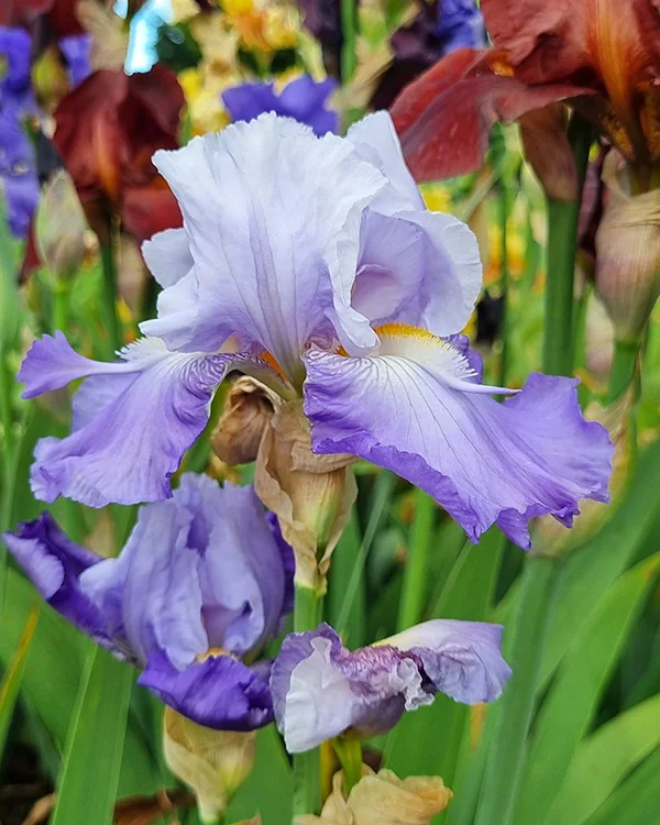 ‘Wing Commander’ (George Sutton, R. 1997). Seedling# G-17 ARSA. TB, 35″ (89 cm). Late midseason bloom. Standards wistaria blue (RHS 92D) infused and veined princes blue (105A) at base; style arms wistaria blue; falls princes blue, pale wistaria blue central area; beards orange, white base, end white tipped orange and with white arms ending with 1″ to 2″ princess blue flounce; ruffled, laced; slight sweet fragrance. ‘Mystic Lace’ X ‘Let’s Pretend’. Sutton 1998